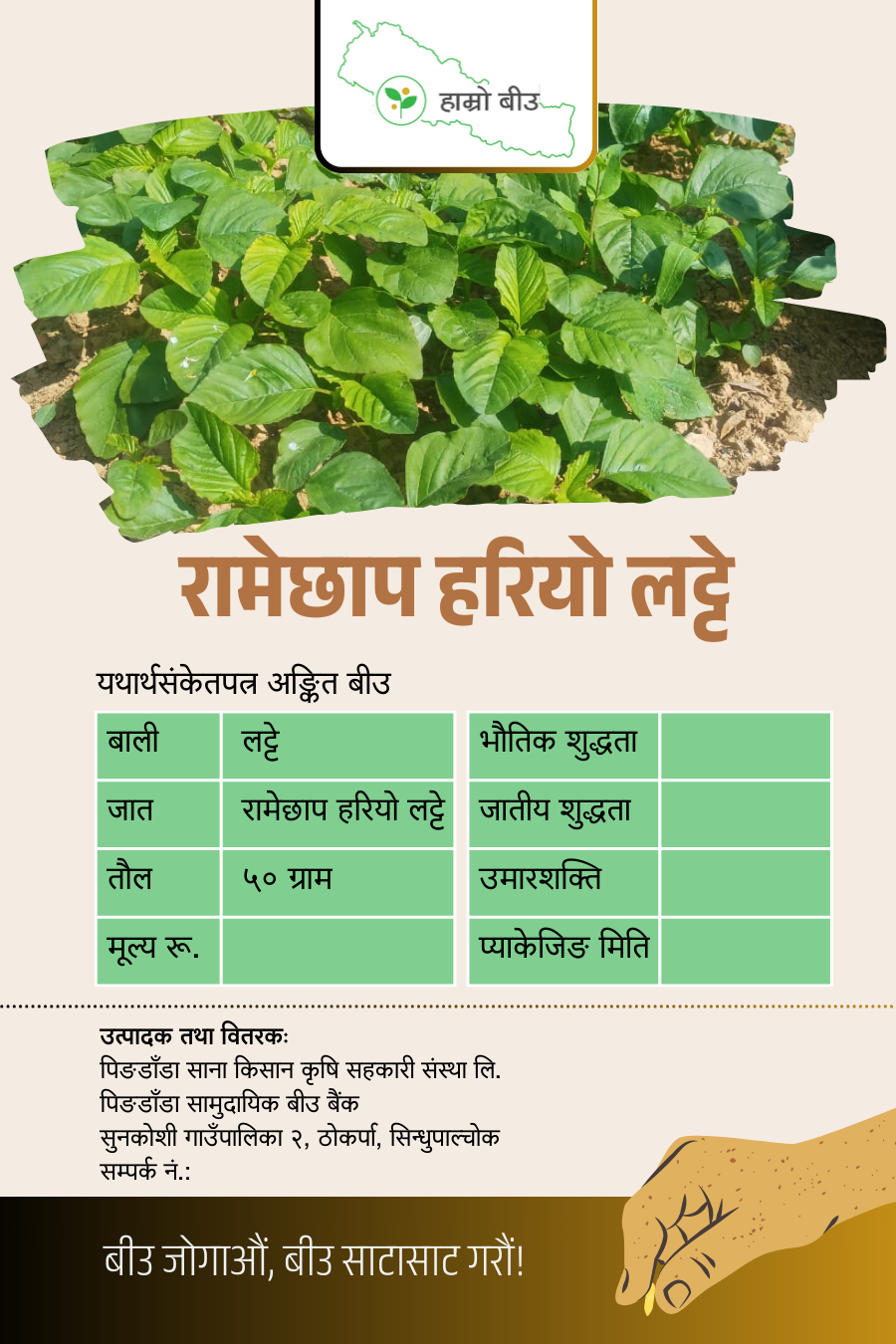 This variety is well-suited for cultivation in regions ranging from the Terai to elevations of 1,650 meters above sea level. Typically sown in Chaitra (March–April), it is harvested by Asar (June–July), making it an ideal seasonal crop for leafy greens. It is particularly valued for its high nutritional content, including rich levels of iron, calcium, and magnesium. While it is consumed as a leafy vegetable, similar varieties like Rato Latte are promoted for grain production.